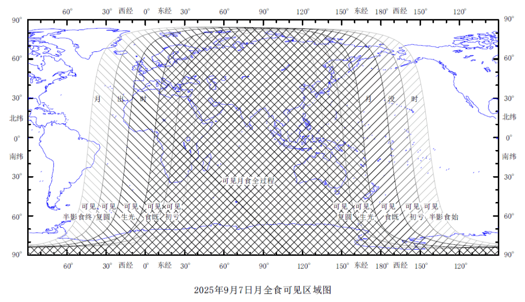 △2025年9月7日月全食见食区域图(开首:紫金山天文台)